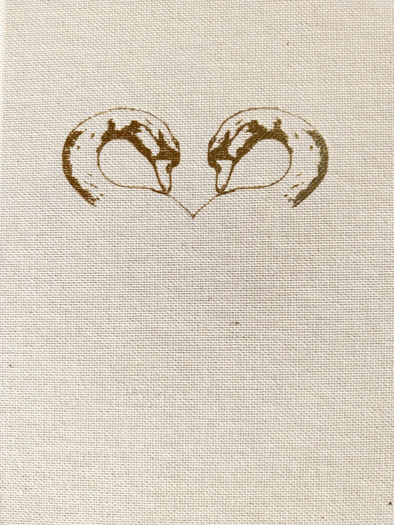 Soms vallen vorm en inhoud samen. Een apart formaat, geen titel, geen auteur – alleen een ambachtelijke linnen kaft, zacht en ruw tegelijk, met twee gouden zwanen erop, in reliëfdruk natuurlijk.